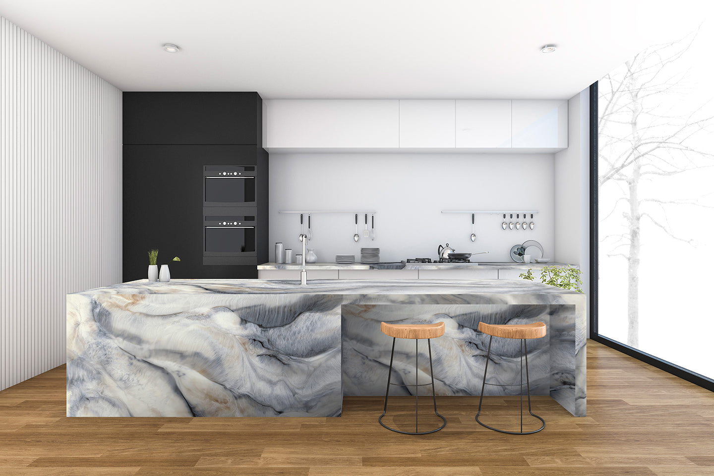 versatilitate: insule „waterfall”, blaturi, backsplash continuu, pereți de accent;
