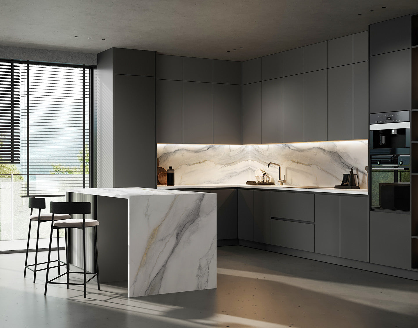 Alba Longa combină puritatea elegantă a albului cu linii orizontale în gri și auriu, desenând o compoziție calmă și sofisticată. Venele, inspirate de natură, adaugă profunzime și creează un efect vizual puternic, care își schimbă subtil reflexiile în funcție de direcția luminii. De la bucătării moderne la băi luxoase, Alba Longa devine un fundal rafinat și coerent, cu un aer artistic atemporal.