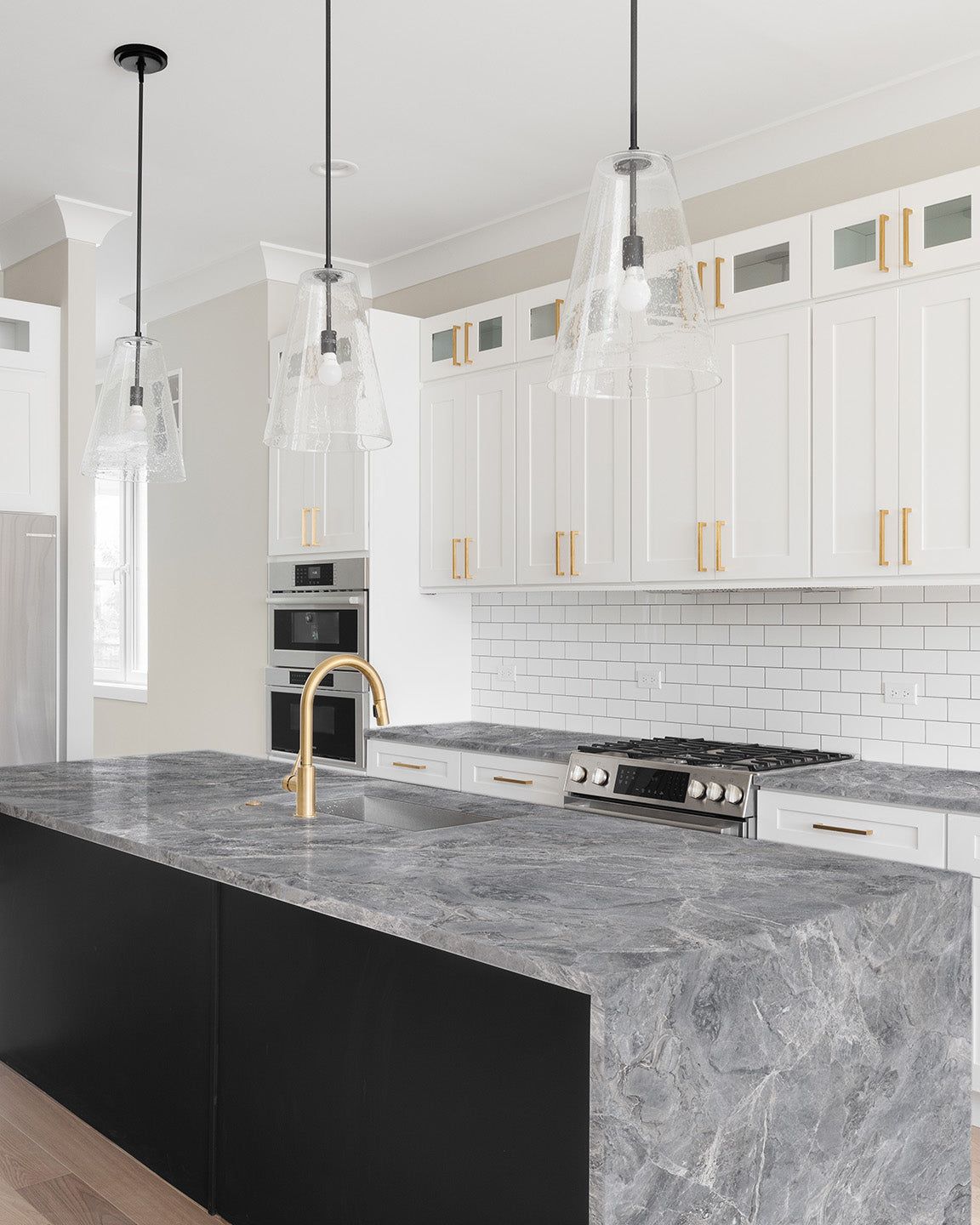 versatilitate ridicată: insule tip „waterfall”, blaturi, backsplash integral, pereți de accent;
