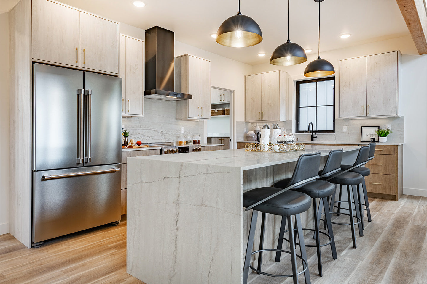 versatilitate: insule tip „waterfall”, blaturi, backsplash, pereți de accent;
