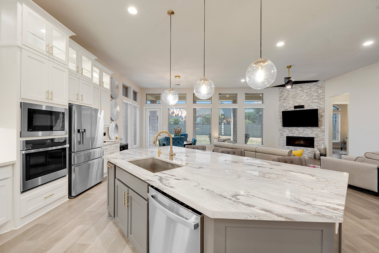 versatilitate: insule tip „waterfall”, blaturi, backsplash, pereți de accent;