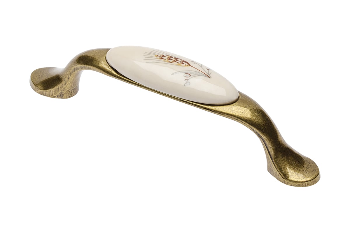 Mânerul Country aduce un plus de eleganță clasică pieselor de mobilier datorită designului său în arcadă și inserției de porțelan cu motiv floral „spic de grâu”. Finisajul de alamă antichizată îi oferă un aspect rustic și autentic, ideal pentru bucătării sau mobilier vintage.
