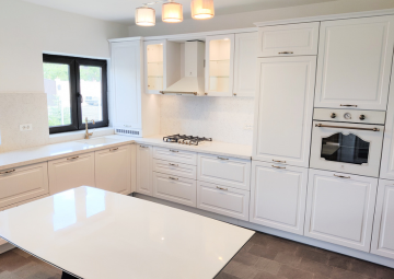 Mobilier de bucătărie fabricat la comandă de NORVINIA Brașov, realizat în stil tradițional cu accente clasice. Bucătăria este echipată cu fronturi din MDF termoformat, care conferă un aspect elegant și atemporal. Blatul, contrablatul și glaful sunt executate din cuarț compozit, un material rezistent și rafinat, cu chiuveta montată sub blat pentru un plus de funcționalitate și estetică.