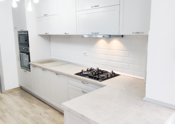 Mobila de bucătărie NORVINIA, realizată la comandă, se remarcă prin eleganța și funcționalitatea sa. Blatul termorezistent cu îmbinare colț tip „tată-mamă” invizibilă asigură un aspect continuu și uniform, oferind atât rezistență, cât și rafinament estetic.