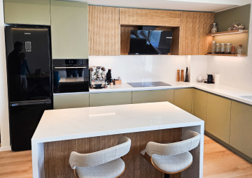 Această bucătărie modernă NORVINIA este realizată cu fronturi din MDF termoformat, îmbinate armonios cu un blat elegant din cuart compozit și o chiuvetă montată sub blat. Contrastul dintre textura lemnului și nuanțele mate ale fronturilor adaugă personalitate spațiului, iar detaliile bine finisate conferă un aer sofisticat și funcțional.