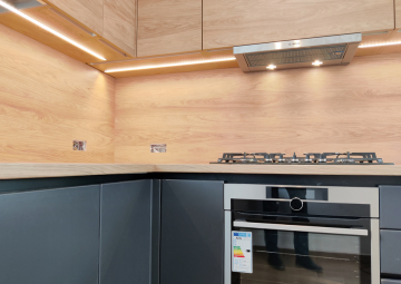 Mobilierul de bucătărie NORVINIA Brașov impresionează prin designul modern și funcționalitatea bine gândită, având un blat realizat în formă de „L”, cu îmbinare invizibilă tip tată–mamă, care oferă atât rezistență, cât și un aspect impecabil, fără întreruperi vizuale. Blatul și contrablatul sunt perfect armonizate, creând un efect unitar de continuitate, iar sertarele cu extragere completă și amortizoare integrate adaugă un plus de confort și ergonomie. Contrastul dintre nuanța caldă a blatului și fronturile mate din MDF termoformat pune în valoare eleganța întregului ansamblu, oferind un spațiu de lucru rafinat, durabil și ușor de întreținut.