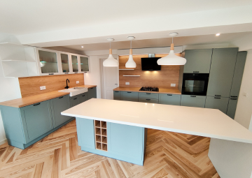 Această bucătărie NORVINIA este pusă în valoare de insula elegantă realizată din cuarț compozit, îmbinată la 45° pentru un aspect continuu și rafinat. Fronturile din MDF înfoliat profilat aduc un aer clasic reinterpretat, completat de blatul termorezistent cu textură de lemn, ce adaugă naturalețe și căldură spațiului. Designul reușește să îmbine estetica modernă cu funcționalitatea practică, oferind un ambient primitor și sofisticat.