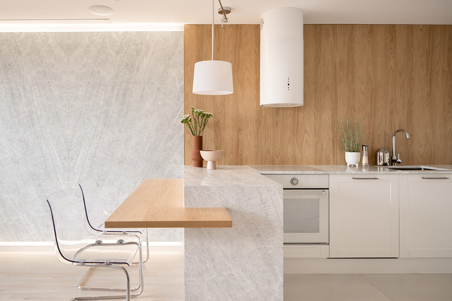 versatilitate: insule tip „waterfall”, blaturi, backsplash, pereți de accent;