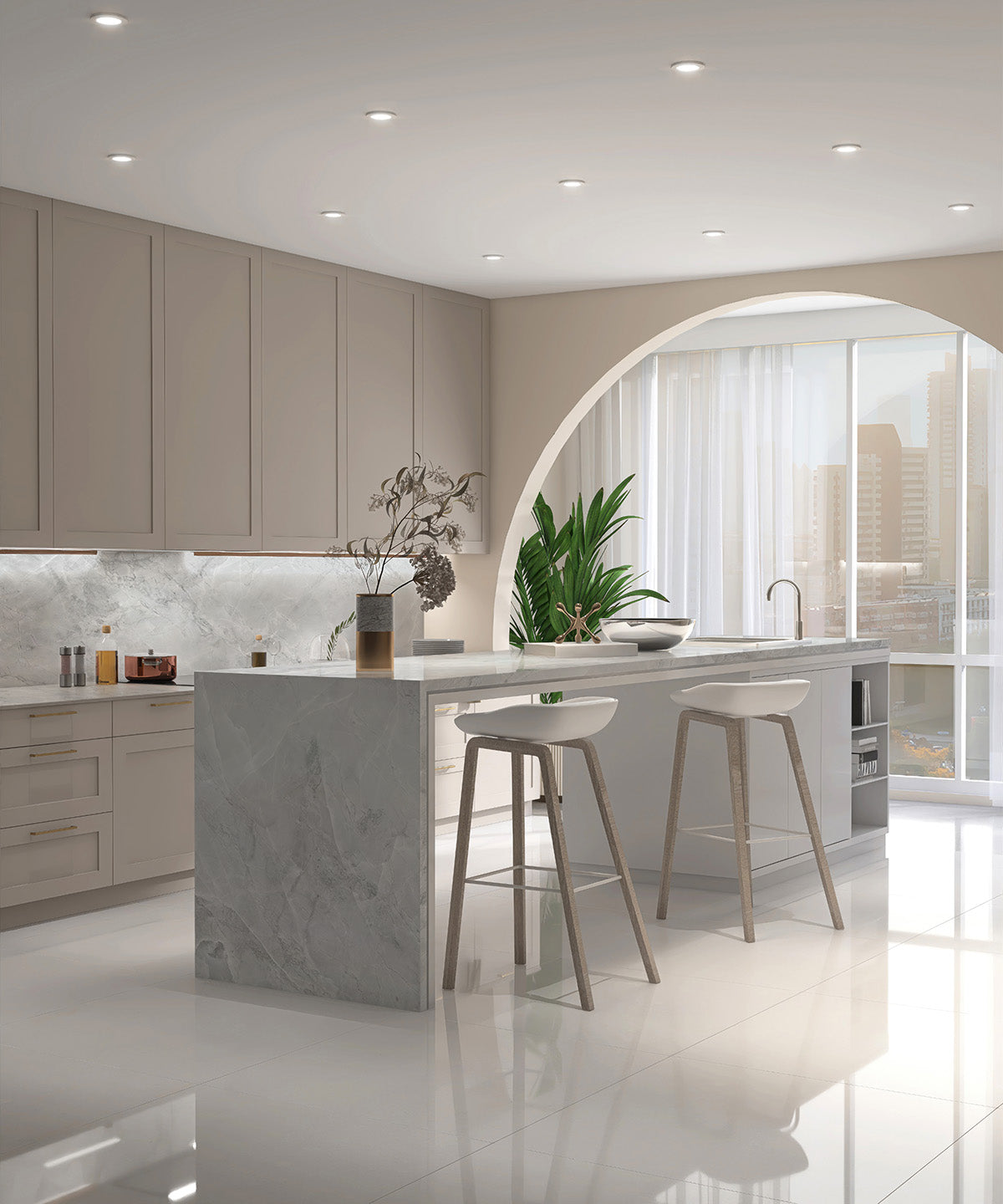 versatilitate: insule „waterfall”, blaturi, backsplash continuu, pereți de accent;