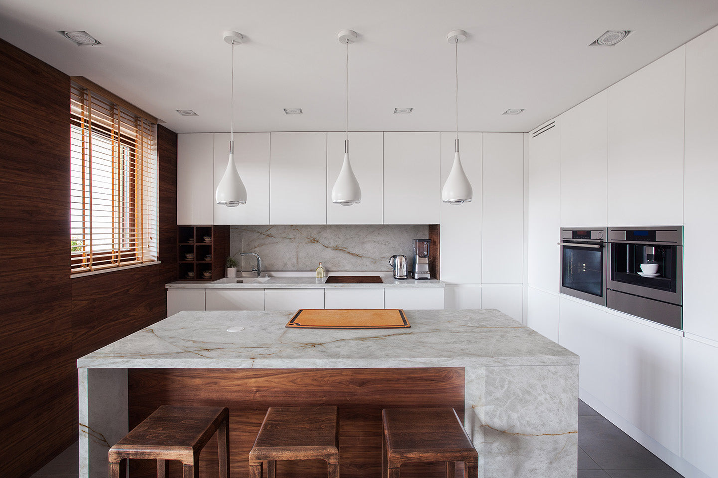 versatilitate: insule tip „waterfall”, blaturi, backsplash, pereți de accent;