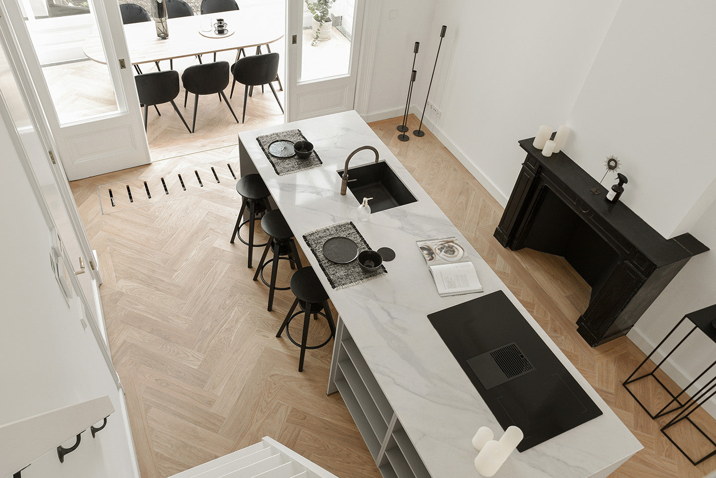 versatilitate: insule tip „waterfall”, blaturi, backsplash, pereți de accent;